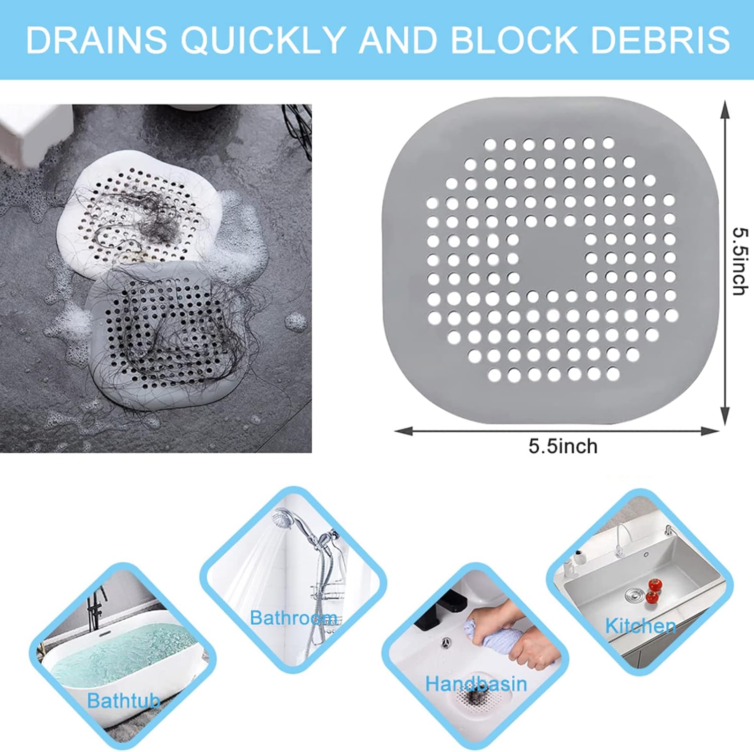 【Warm Tips】 Requires the drain must be flat and smooth with no raised obstructions. Otherwise it can’t be suction.The shower hair catcher size: 5.9*5.9in, suitable for all of less than 4.7*4.7inch outlet of sinks, bathroom or tubs drain.
